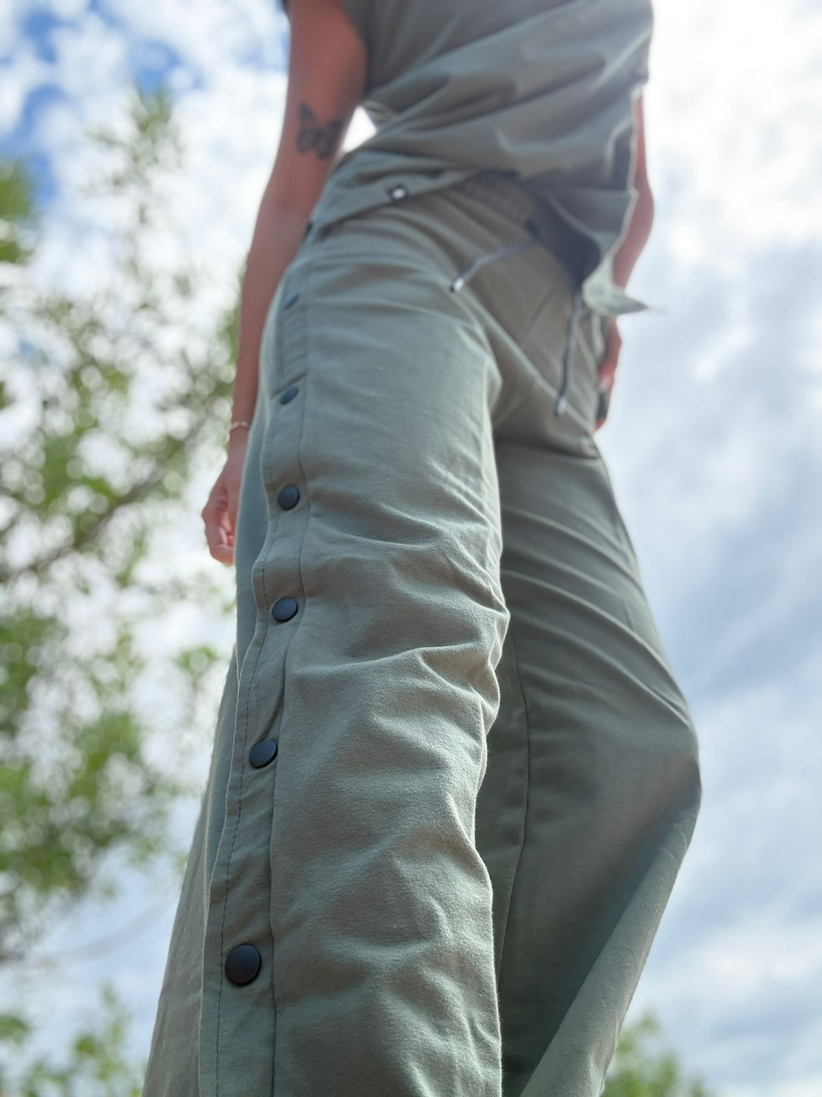 Pantalón palazzo rústico ancho con elástico en cintura, recortes laterales y broches – VERDE MILITAR